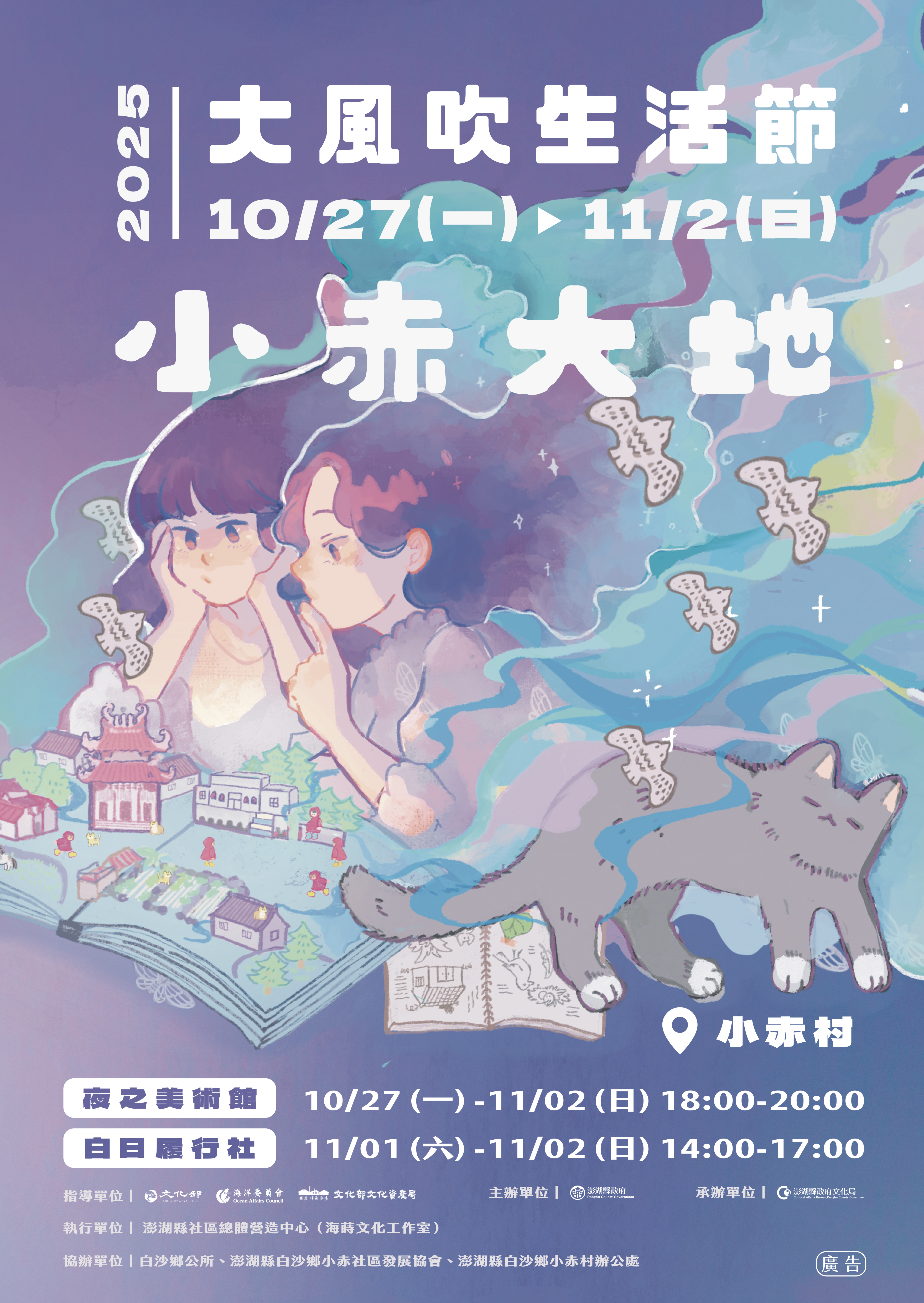 一、為整合澎湖縣社區總體營造及宮廟小法人才培育等計畫成果,訂於114年10月27日(一)至11月2日(日)於白沙鄉小赤村辦理「小赤大地一大風吹生活節」。