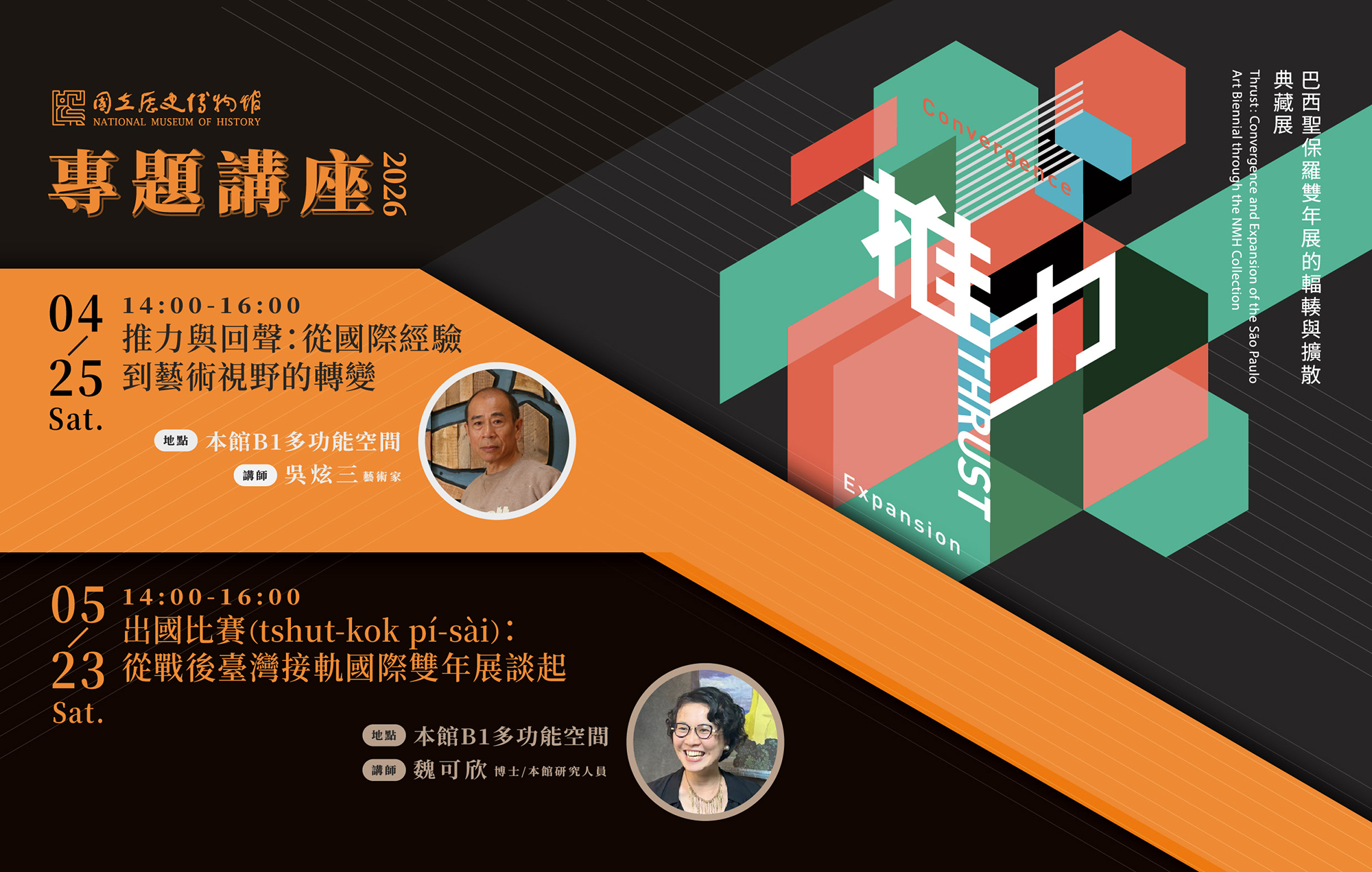 二、為深化觀展內涵,展期間邀請藝術家吳炫三老師與本次策展人魏可欣博士,進行專題講座,講座相關資訊如下: