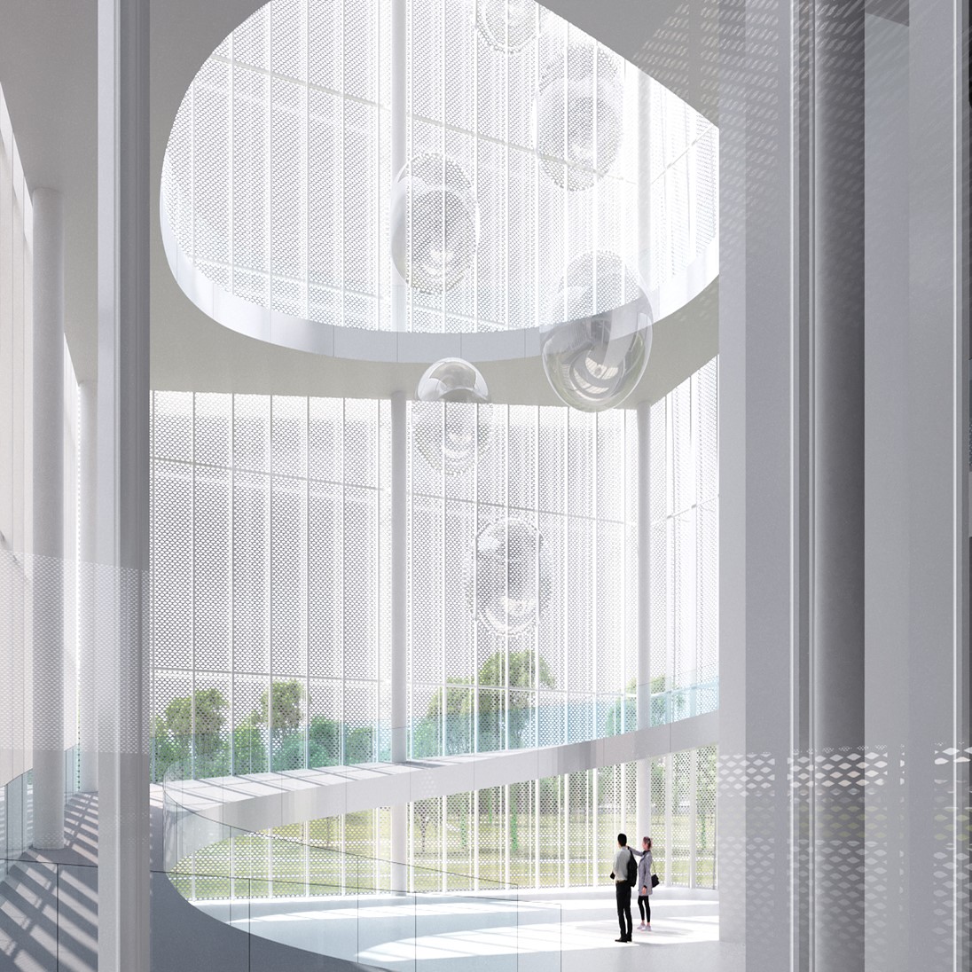 臺中市立美術館(以下簡稱「中美館」)位於綠美圖之中,是一個跨越邊界,開拓想像的場域。自2024年3月啟動機構營運後,中美館不僅是為藝術而生的場所,更與臺中市立圖書館共構形成嶄新的文化場域「臺中綠美圖」。建築由妹島和世與西澤立衛組成的SANAA事務所規劃設計,位於水湳經貿園區內的中央公園北側,在穿透與流動的建築語言中,形塑出8棟建築量體,美術館與圖書館坐落於不同空間中,藉由高低錯落的通道相互連結,創造出在建築中漫遊探索的全新體驗;而建築空間的高度通透性,則消融了人文與自然的邊界,不僅形塑了跨域且開放的空間,更使建築、自然與大眾相遇,激發新思維,形成更具參與性的藝術文化場域。